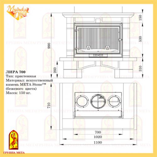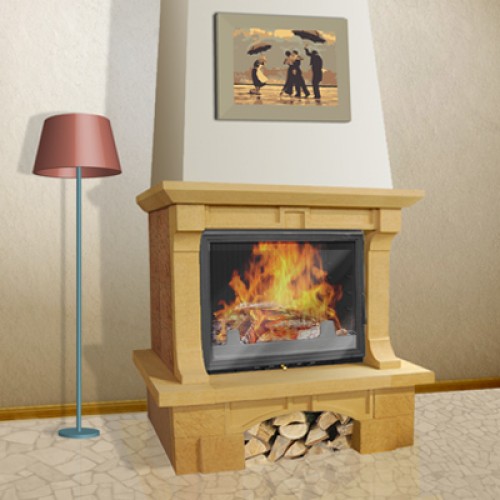 Каминная облицовка Лира 700 изготовлена из камня META Stone™ (бежевого цвета). Вставки в боковые панели выполнены из пеноблока и подготовлены для последующей отделки (может использоваться любая отделка, толщина материала не более 30 мм). Отделочный материал в комплект не входит.