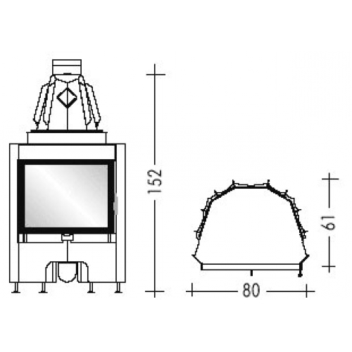 Фронтальная каминная топка с натуральной конвекцией (N) и боковым открытием дверцы. Дровяная топка с металлической структурой и футеровкой очага из огнеупорной керамики. Топка с высоким КПД и низкими показателями выброса продуктов горения в атмосферу, характерен сниженный расход топлива и всегда чистое стекло.