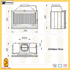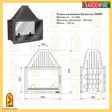 Диаметр выходного патрубка рассчитан на диаметр подключаемой дымоходной трубы в 150 мм. Дымосборник и цоколь окрашены в белый цвет. Притопочная зона выложена огнеупорной керамикой. Встроенные системы «чистое стекло» и «двойной дожиг» топлива.