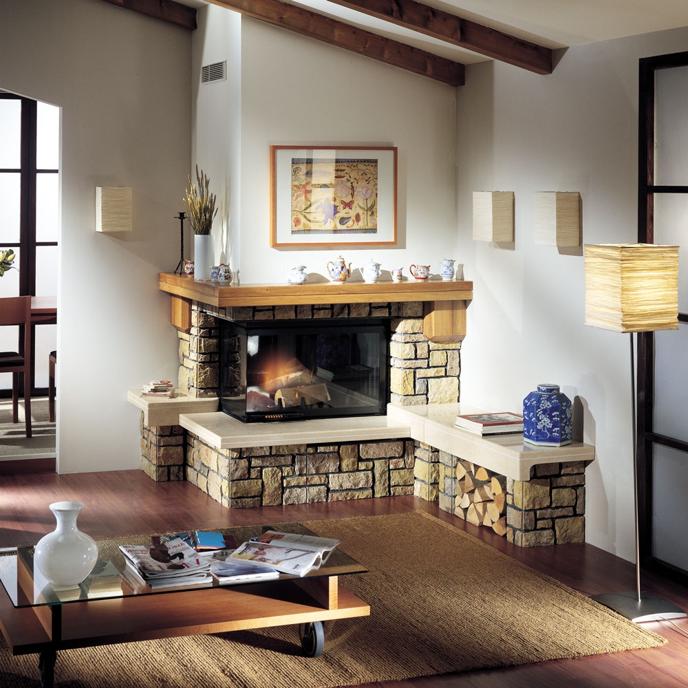 Угловой камин в стиле кантри под закрытую топку, высота цоколя - 38 см. Изготовлен из мрамора Vicentini грубой обработки с плитой из полированного мрамора Trani и дубовой балкой.